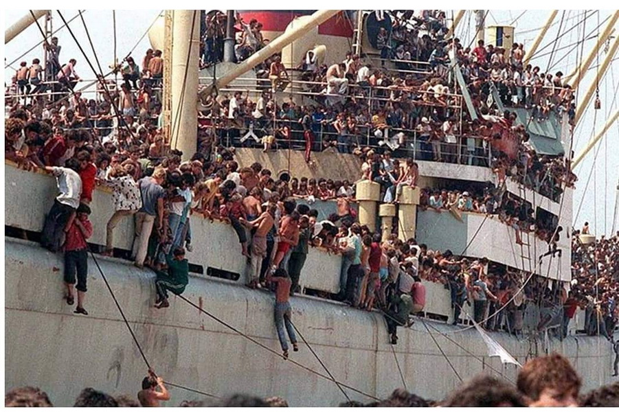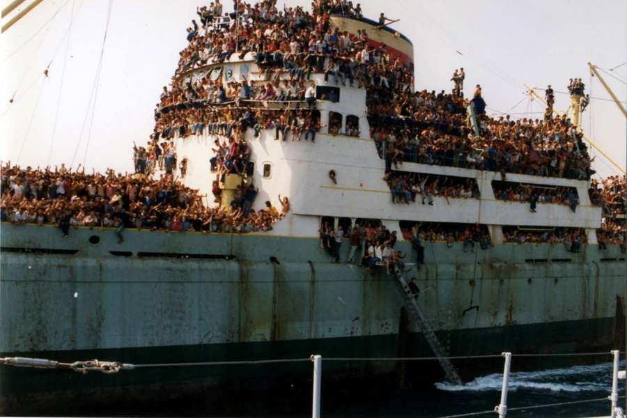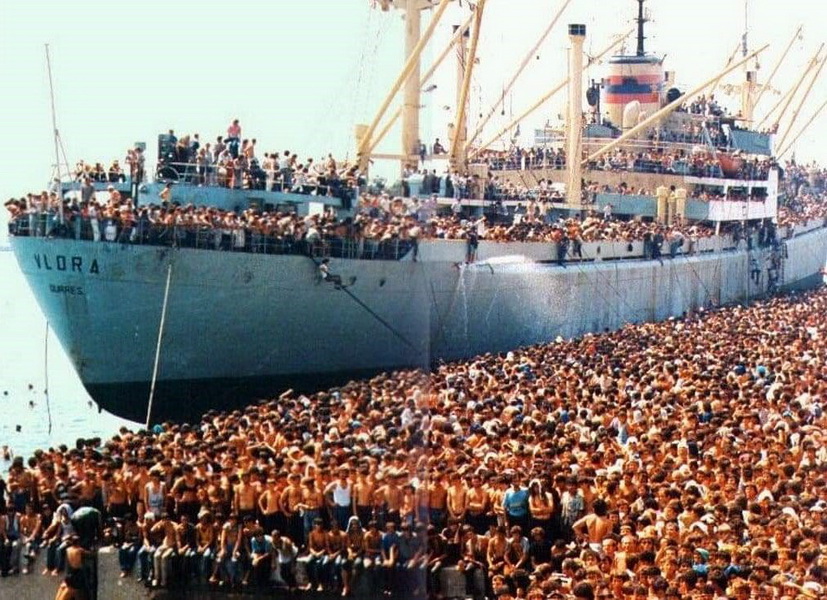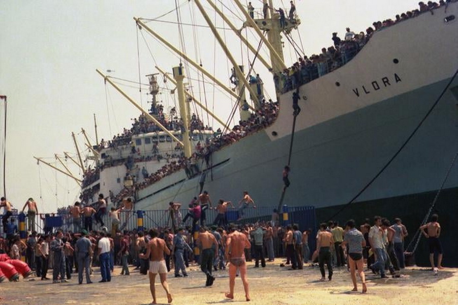 Brod “Vlora” vratio se sa Kube u luku Drač u Albaniji natovaren šećerom. U međuvremenu na dokove su pristigle hiljade ljudi željnih da iz Albanije pobegnu u “obećanu zemlju” – Italiju. Raspad komunističkog režima, najrigidnijeg u Evropi i prizori blagostanja sa druge strane Jadrana koje su mogli da vide na satelitskim kanalima – učinili su da se na “Vloru” tog 7. avgusta ukrca oko 20.000 ljudi. Većina njih popela se na brod uzveravši se iz mora uz brodske konopce. Bukvalno svaki kvadratni metar na brodu bio je ispunjen ljudima a mnogi od njih visili su na konopcima tokom celog prelaska Jadrana.